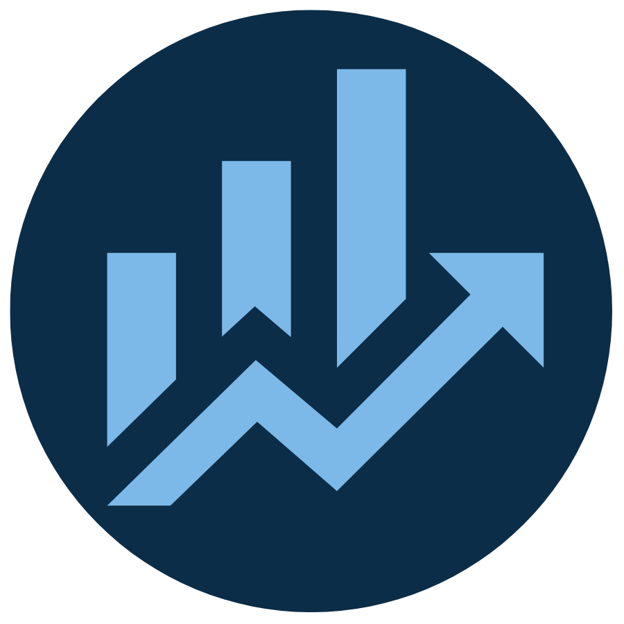 light blue bars showing growth with an arrow that is going up and to the right on a circular dark blue background